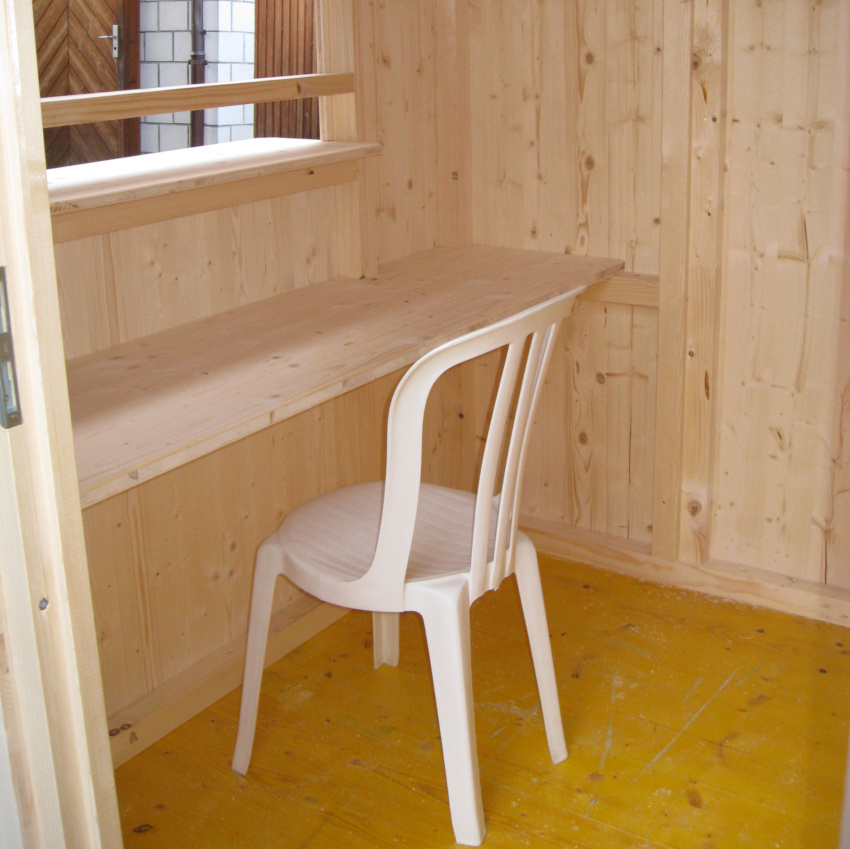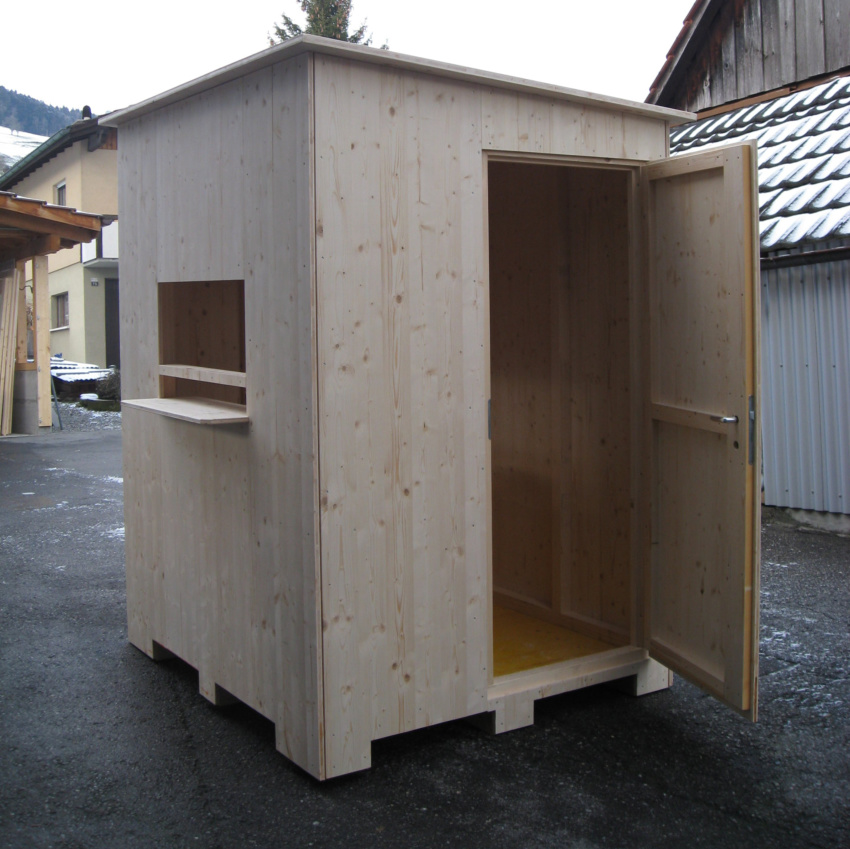 Kassahaus aus Holz für den Ganzjahresbetrieb geeignet und abschliessbar. Heizung und Beleuchtung installiert (220C-Zuleitung erforderlich) Abmessung: 1.80 m x 1.60, Höhe 2.30 cm Kassenhaus Aussenansicht Kassenhaus Innenansicht