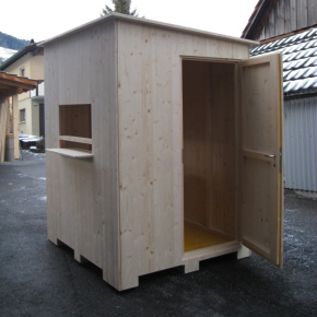 Kassahaus aus Holz für den Ganzjahresbetrieb geeignet und abschliessbar. Heizung und Beleuchtung installiert (220C-Zuleitung erforderlich) Abmessung: 1.80 m x 1.60, Höhe 2.30 cm Kassenhaus Aussenansicht Kassenhaus Innenansicht